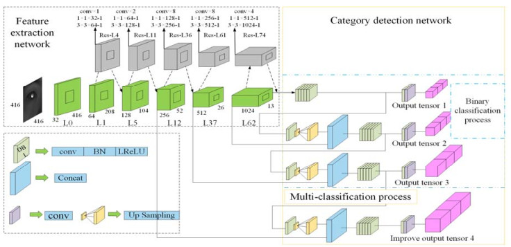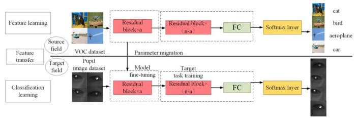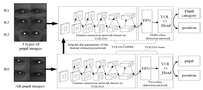 To address the problems of low diopter recognition accuracy and low detection efficiency in the pupil area, this paper proposes a pupil image detection algorithm based on an improved YOLOv3 deep neural network. First, a two-class detection network YOLOv3 base for extracting the main features of the pupil is constructed to strengthen the learning ability of the pupil characteristics. Subsequently, through migration learning, the training model parameters are migrated to YOLOv3-DPDC to reduce the difficulty of model training and poor detection performance caused by the uneven distribution of sample data. Finally, fine-tuning is used to quickly train the YOLOv3 multi-classification network to achieve accurate pupil diopter detection. An experimental test was performed using the 1200 collected infrared pupil images. The results show that the average accuracy of diopter detection using this algorithm is as high as 91.6%, and the detection speed can reach 45 fps; these values are significantly better than those obtained using Faster R-CNN for diopter detection.