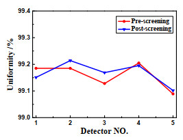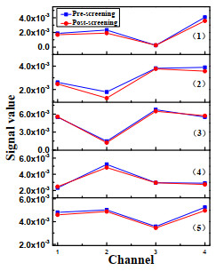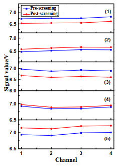 Space science instruments use solar-guide mirror pointing and tracking systems based on four-quadrant photodetectors to achieve precise pointing control of the sun. To satisfy the requirements of high precision and stability, a four-quadrant photodetector screening method for space applications was proposed, and a screening system for the four-quadrant photodetector was developed. By comparing the dark current, responsivity, and quadrant responsivity uniformity of the four-quadrant detector before and after the screening test, the space-environment adaptability of the detector was analyzed according to the discriminant criteria. Additionally, detectors with early failures or large changes in performance can be eliminated. The results show that the developed screening system has high accuracy, and the equivalent input-current noise at the front end of the system is 0.58 fArms. After the screening test, the maximum absolute value of the dark current of each channel of the detector selected according to the evaluation standard was 6.08 pA. The maximum change in the response of each channel was 0.716%, and the maximum change in the response of each quadrant before and after the nonuniformity screening was 1.24%. Finally, the four-quadrant detector was applied to the solar guide mirror pointing and tracking system, and met the requirements of aerospace environmental conditions. The screening device and screening method can be employed to screen four-quadrant photodetectors for space applications, providing significance reference for the screening of other photoelectric devices.