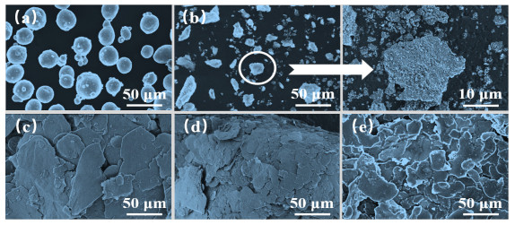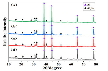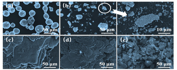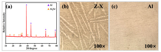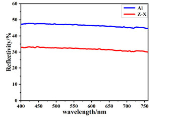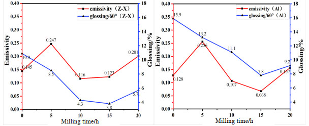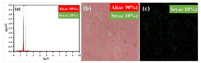 To evaluate the nature of the low gloss properties of Al-Sr10, X-ray diffraction, X-ray energy dispersive spectroscopy, face scan elemental analysis, 8−14 μm infrared emissivity, gloss, and 400−760 nm visible reflectance tests are performed on the material. The Al-Sr10 filler is prepared by high-energy ball milling, and changes in the components, morphology, and optical properties of the Al-Sr10 filler with the ball milling time are evaluated by scanning electron microscopy. The results show that the surface of Al-Sr10 is easily oxidized to form gray-black strontium oxide, and the effect of strontium in the solid solution leads to the extinction of the material. The components of the Al-Sr10 filler do not change with the ball milling time, and the lamellarization, emissivity, and gloss properties of the material increase with time. The degree of lamellarization of the filler after 15 h of ball milling is high, the emissivity is as low as 0.123, and the gloss is as low as 3.8.