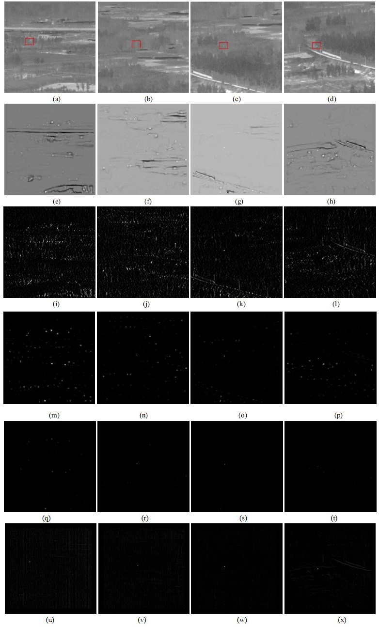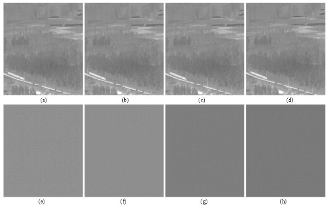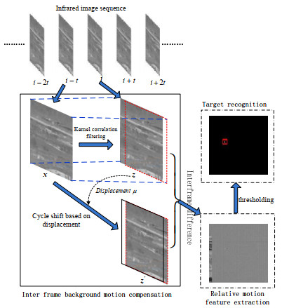 To improve the performance of infrared target detection, weak and small infrared target detection combined with frame difference kernel correlation filtering is proposed. First, the current frame is trained by kernel correlation filtering to obtain the maximum regression value. Then, the difference value is calculated relative to the interval frame to perform a cyclic shift to compensate for the background motion between frames. The relative motion features of the current frame are extracted using the interframe difference method, which enhances the ability to distinguish weak and small targets from the infrared background. Finally, threshold segmentation is performed on the relative motion features to obtain the final detection results. Simulation experiments show that the proposed algorithm effectively detected weak and small infrared targets in complex environments. Compared with similar algorithms, the proposed algorithm suppressed clutter and point-shaped interference sources, and achieved a higher target detection rate. Simultaneously, a large number of operations are placed in the frequency domain, and the operational efficiency is better than that of other algorithms.
