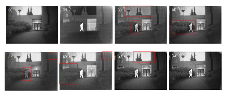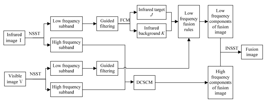 Abstract: To solve the problems of vague targets, detail loss, and algorithm instability in traditional infrared and visible-light image fusion algorithms, a fusion method based on fuzzy c-means (FCM) clustering and guided filtering is proposed. The low-frequency sub-band was enhanced by guided filtering after applying a non-subsampled shearlet transform (NSST) to the original image. The low- and high-frequency sub-bands were then fused using FCM clustering and a dual-channel spiking cortical model. Finally, the fused image was obtained using an inverse NSST transform. The experimental results showed that the proposed algorithm was stable, the fusion image had clear targets and relatively complete details in the subjective evaluation, and the algorithm had an excellent standard deviation, mutual information, average gradient, information entropy, and edge retention factor in the objective evaluation.
