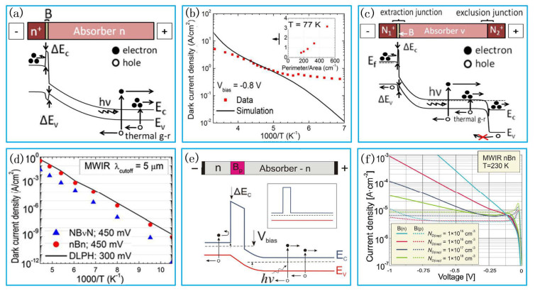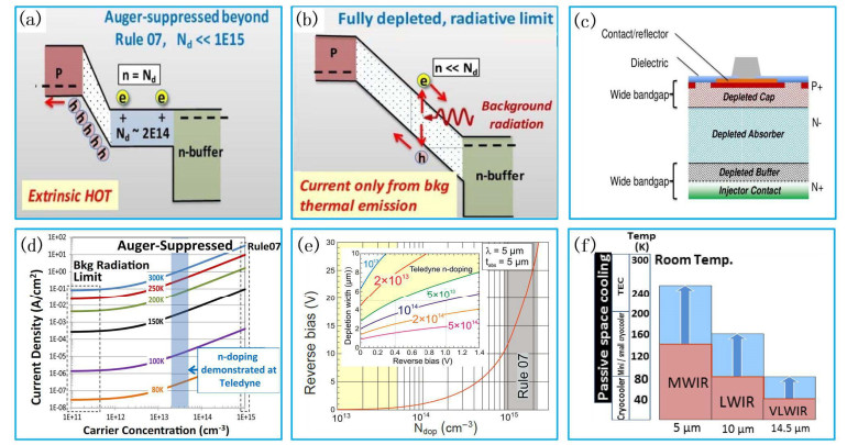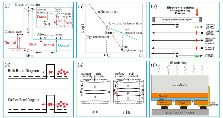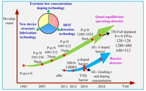 The HgCdTe multilayer heterojunction technology is an important direction for the development of mainstream infrared detectors in the future, playing an important role in high-performance infrared detectors, such as high operating temperature (HOT) detectors, dual/multicolor detectors, and avalanche photodiodes (APDs). Recently, HgCdTe HOT infrared detectors based on multilayer heterojunction technology have been developed, particularly devices based on the barrier and non-equilibrium operating P+-π(ν)-N+ structure have been widely studied. In this review, the dark current suppression mechanisms of P+-π(ν)-N+ structure HgCdTe infrared detectors with barrier and non-equilibrium operations were systematically introduced, the key problems that restrict the development of these two types of devices were analyzed, and the relevant research progress was reviewed. We summarized and assessed the prospects of the development of multilayer heterojunction HgCdTe infrared detectors.
