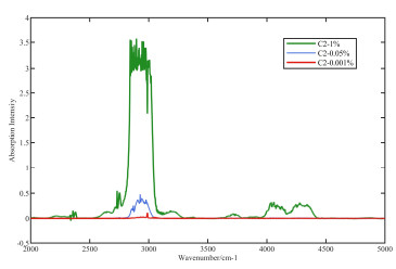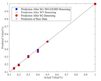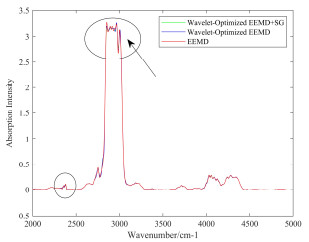 Infrared spectral gas analysis technology has gradually become the main analytical method for gas logging owing to its advantages of non-pollution, high detection efficiency, and accurate analysis. However, because of factors, such as numerous types of hydrocarbon gases in the formation fluid and a large concentration range span, the measured spectral data are complicated. Therefore, the pre-processing of the spectral data is crucial as it directly impacts the accuracy of the measurement results. Noise is a significant interference factor, and improving the noise reduction process for the spectral data is crucial. To solve this problem, this study proposes a wavelet transform optimized ensemble empirical mode decomposition (EEMD) combined with Savitzky-Golay filtering (S-G) for the infrared spectral noise reduction algorithm. This algorithm first uses EEMD to decompose the signal to obtain a set of IMF components. It then uses wavelet transform for wavelet threshold denoising on the IMF components. Finally, the denoised IMF components are reconstructed, followed by S-G. The experimental results show that the algorithm can not only remove the Gaussian white noise and impulse noise in the absorption spectrum but also improve the smoothness index of the absorption spectrum and enhance the accuracy of logging gas detection.