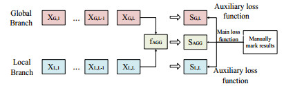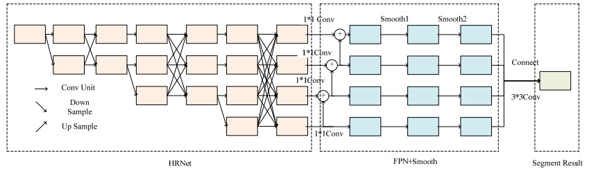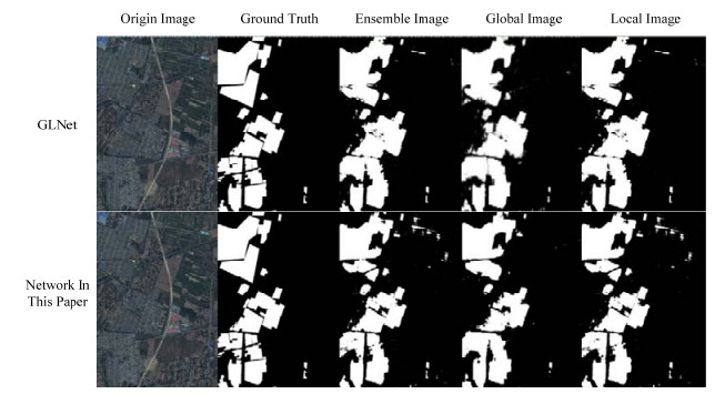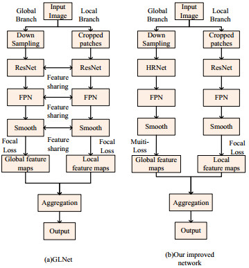 The backbone of a convolutional neural network global branch, a residual network (ResNet), obtains low-resolution feature maps at side outputs that lack feature representation. The local branch aggregates the feature maps in the global branch, which are not fully learned, resulting in a negative impact on image segmentation. To solve these problems in GLNet (Global-Local Network), a new semantic segmentation network based on GLNet and High-Resolution Network (HRNet) is proposed. First, we replaced the original backbone of the global branch with HRNet to obtain high-level feature maps with stronger representation. Second, the loss calculation method was modified using a multi-loss function, causing the outputs of the global branch to become more similar to the ground truth. Finally, the local branch was trained independently to eliminate the confusion produced by the global branch. The improved network was trained and tested on the remote sensing image dataset. The results show that the mean absolute errors of the global and local branches are 0.0630 and 0.0479, respectively, and the improved network outperforms GLNet in terms of segmentation accuracy and mean absolute errors.