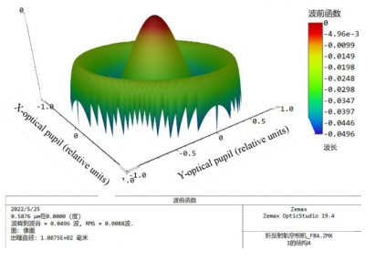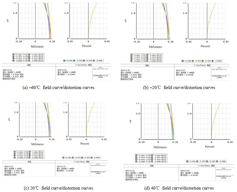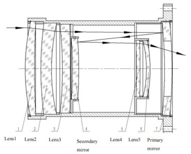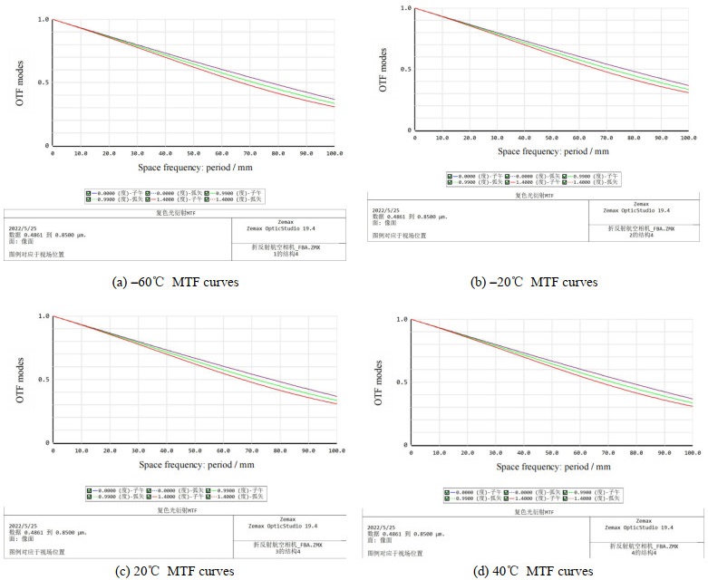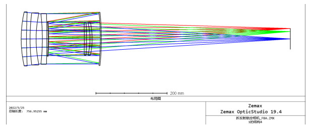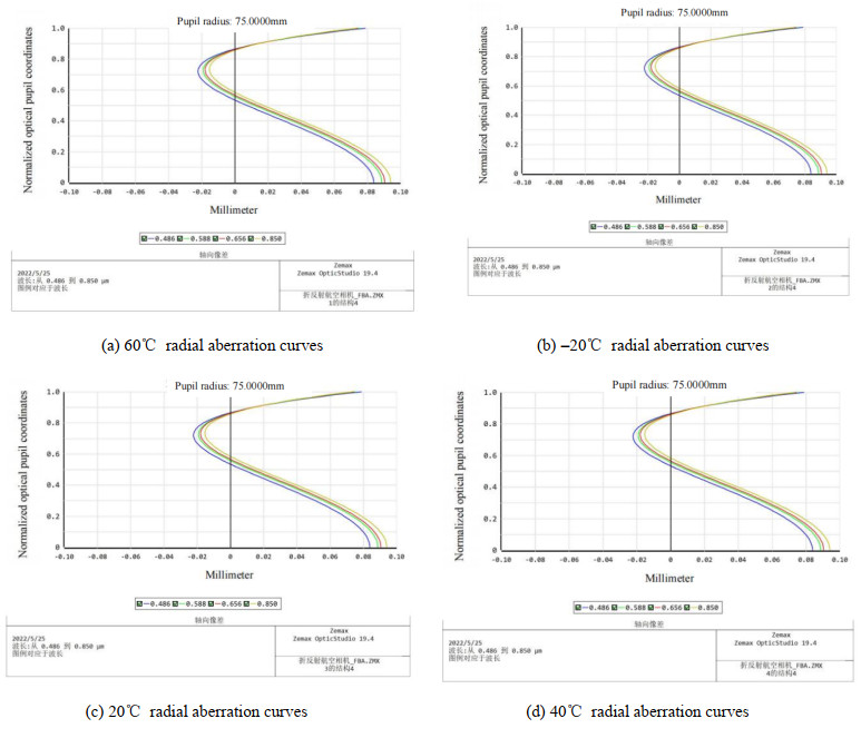 To achieve all-weather observations in the 15000 m stratosphere and meet the ground resolution of 470–1500 nm, a long-forward charge-coupled device (CCD) aerial camera was proposed. By correcting the secondary spectra generated by the long focal length and large aperture using H-ZK 7 with ZF6, the rate color difference control meets the design requirements. The temperature curve of the system at different heights was analyzed via thermal analysis of the optical system. The detector adopted a full-frame CCD detector with a single image element of 8 μm and a target surface size of 48 mm × 36 mm; the system reached the diffraction limit at 100 lp/mm, fulfilling the imaging requirements of the system.