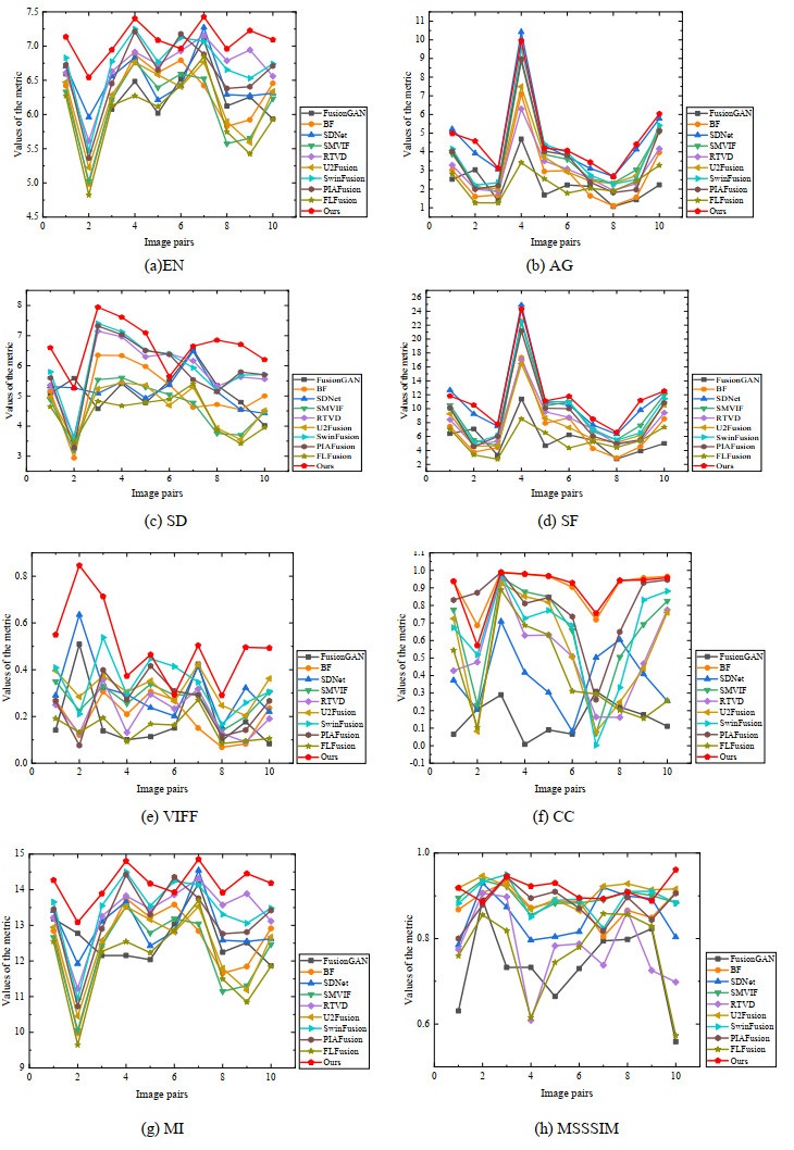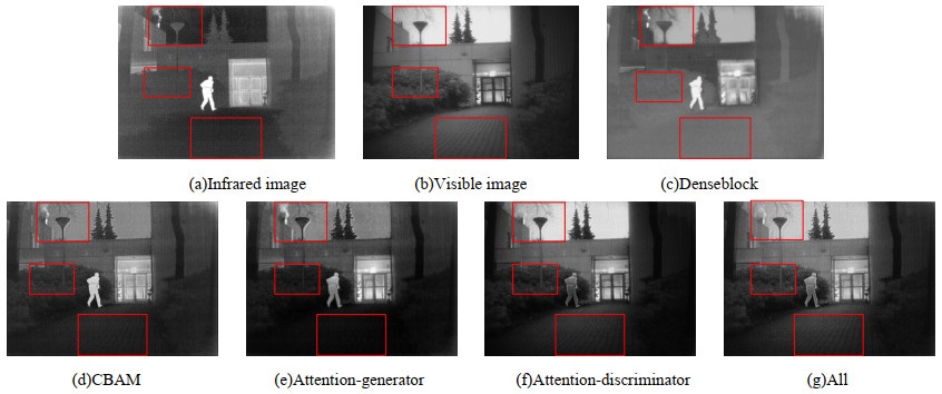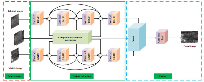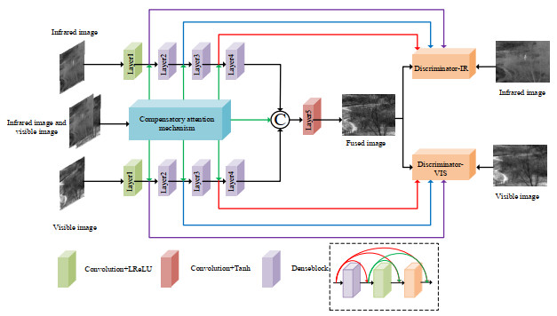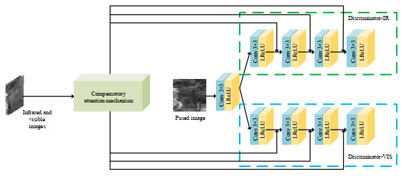 The existing deep learning image fusion methods rely on convolution to extract features and do not consider the global features of the source image. Moreover, the fusion results are prone to texture blurring, low contrast, etc. Therefore, this study proposes an infrared and visible image fusion method with adversarial learning and compensated attention. First, the generator network uses dense blocks and the compensated attention mechanism to construct three local-global branches to extract feature information. The compensated attention mechanism is then constructed using channel features and spatial feature variations to extract global information, infrared targets, and visible light detail representations. Subsequently, a focusing dual-adversarial discriminator is designed to determine the similarity distribution between the fusion result and source image. Finally, the public dataset TNO and RoadScene are selected for the experiments and compared with nine representative image fusion methods. The method proposed in this study not only obtains fusion results with clearer texture details and better contrast, but also outperforms other advanced methods in terms of the objective metrics.