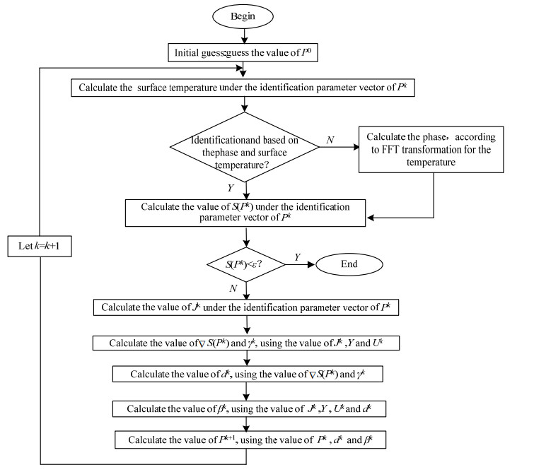 To improve the accuracy of infrared detection and realize synchronous detection of defect depth and size, a conjugate gradient recognition algorithm is integrated with pulsed thermography and pulsed phase thermography. Quantitative identification of infrared technology is achieved based on the phase and surface temperatures. The influence of these factors on the identification result is analyzed using numerical examples. The results show that without temperature errors, the defect is accurately identified based on the phase and surface temperature. The random temperature error decreases the accuracy of the identification result based on the phase and surface temperature. The uniform temperature error decreases the accuracy of the identification result based on the surface temperature. However, the uniform temperature measurement error does not affect the identification result based on the phase.