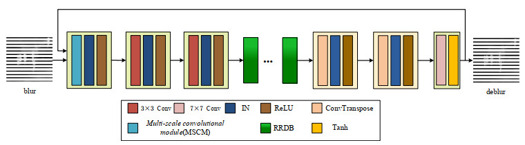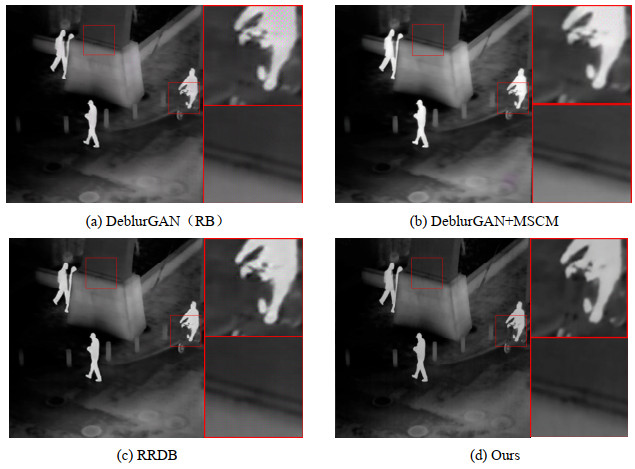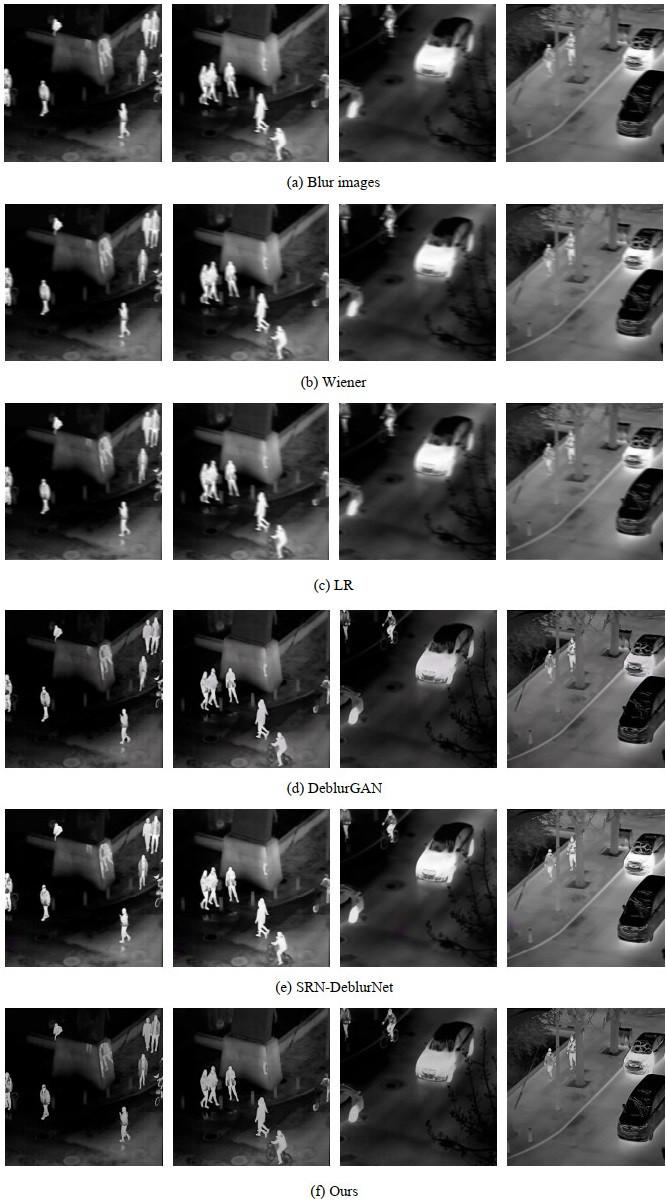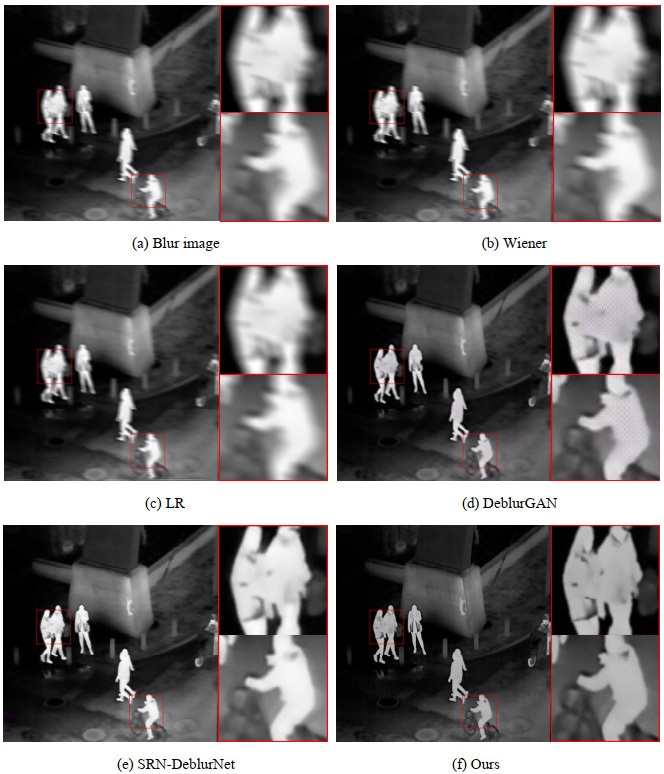 During infrared (IR) image capture, the shaking of camera equipment or rapid movement of the target causes motion blur in the image, significantly affecting the extraction and recognition of effective information. To address these problems, this study proposes an infrared image deblurring method based on a dense residual generation adversarial network (DeblurGAN). First, multiscale convolution kernels are employed to extract features at different scales and levels from infrared images. Second, a residual-in-residual dense block (RRDB) is used, instead of the residual unit in the original generation network, to improve the detail of the recovered IR images. Experiments were conducted on the infrared image dataset collected by our group, and the results show that compared to DeblurGAN, the proposed method improves PSNR by 3.60 dB and SSIM by 0.09. The subjective deblurring effect is better, and the recovered infrared images have clear edge contours and detail information.